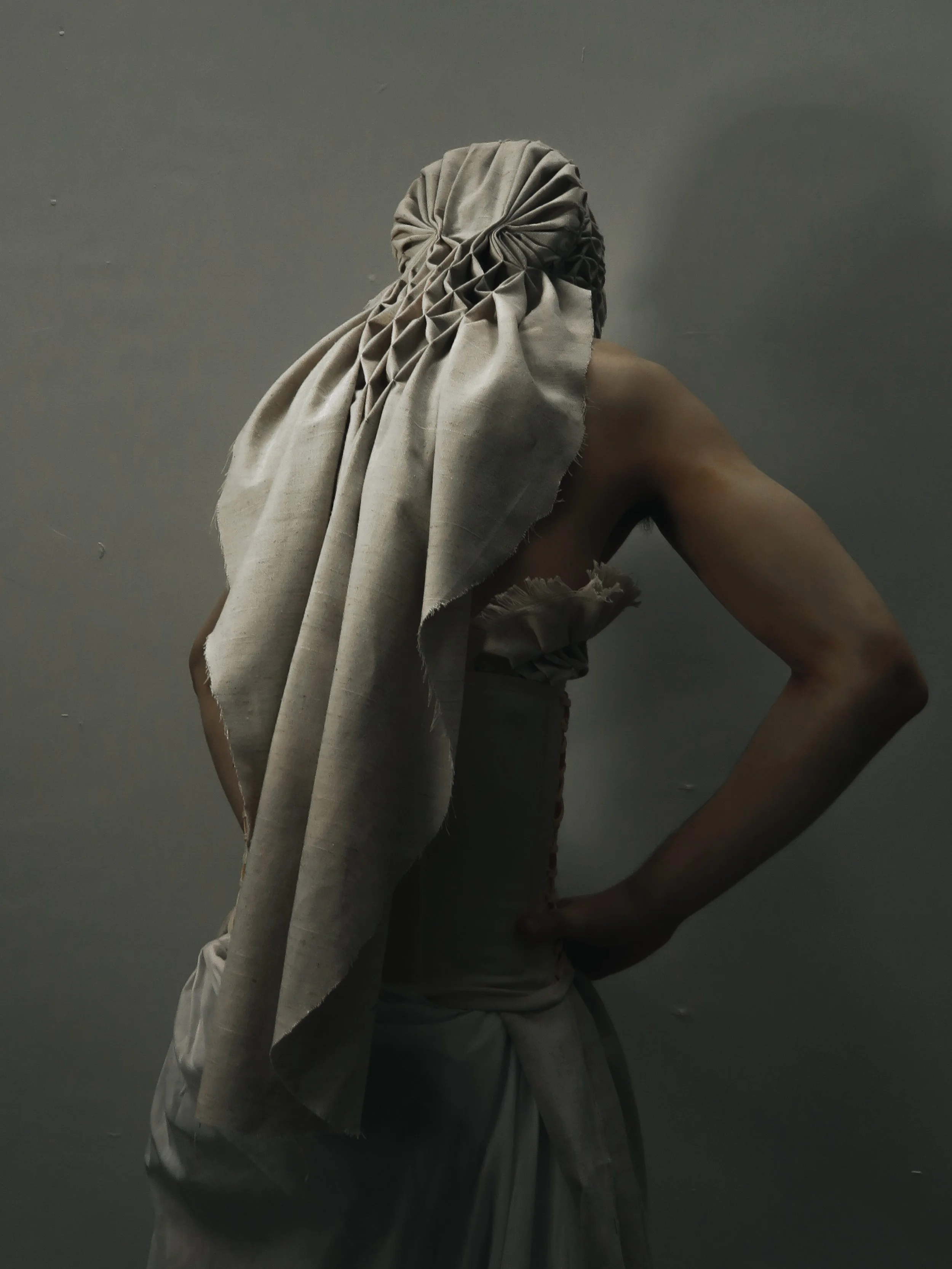 The work embodies a deliberate lingering, prolonging the absurd to observe its lack and recognize it as permanent within the transient. Using traditional textile manipulation techniques rooted in feminine craftsmanship, the designer is compelled to engage in material repetition, countering the relentless novelty of the technological age. Through the rhythmic labor, alienation fades, replaced by a profound connection to the act of making. Creation here is not fleeting or abstract; it is tangible and enduring, offering quiet resistance to a world increasingly dominated by the immaterial.